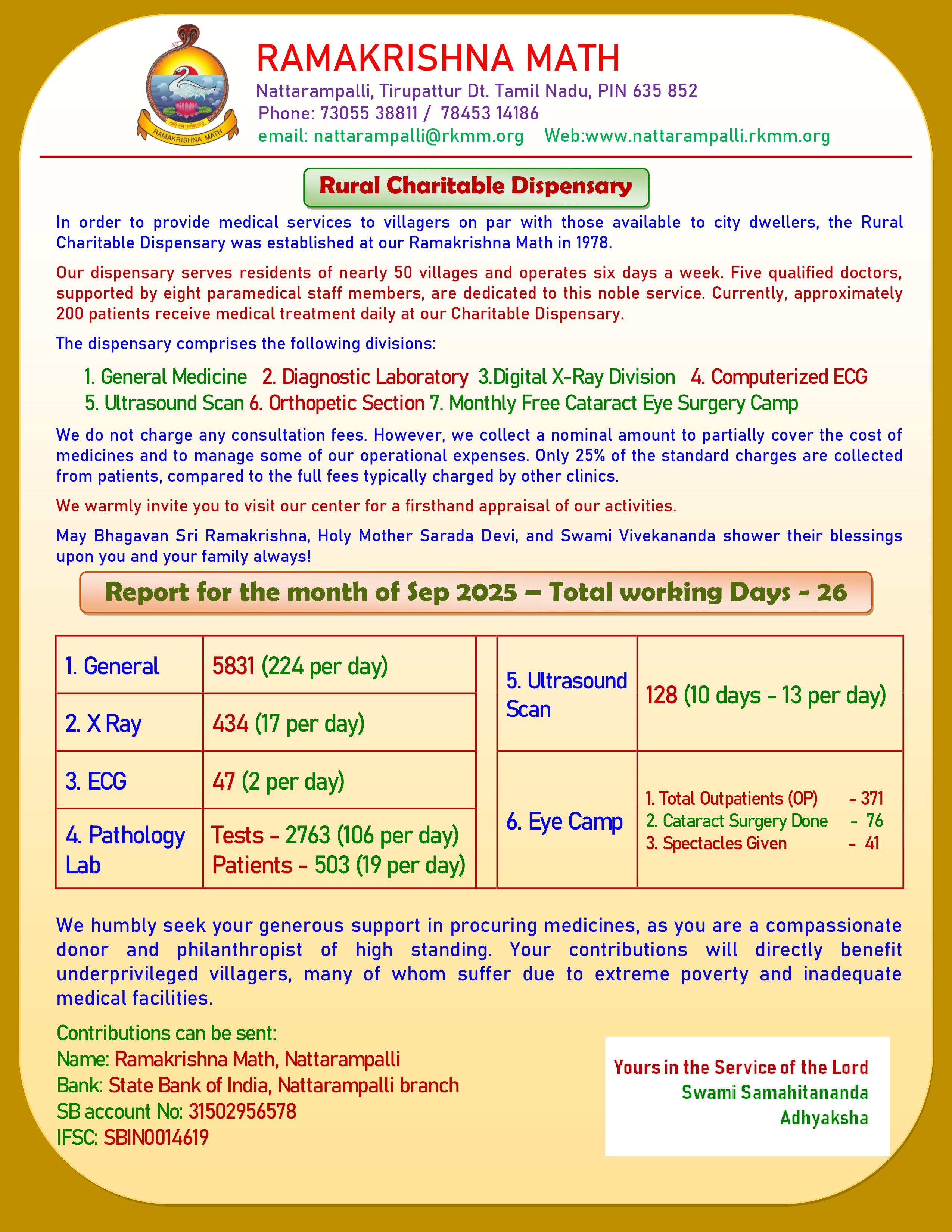 Rural Mobile Dispensary unit is also attached with the charitable dispensary and it runs 6 days a week treating around 70 patients in 3 villages every day there by covering 19 villages every week (4 villages on Tuesday). This is functioning as a feeder service to identify the various illnesses and refer to our Rural Charitable Dispensary depending upon the severity.