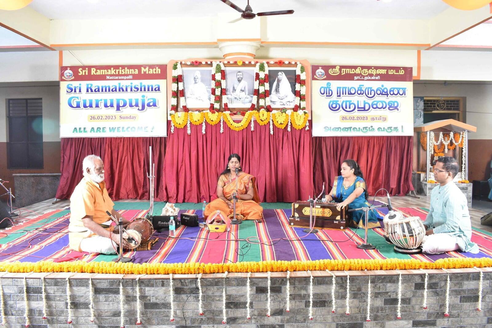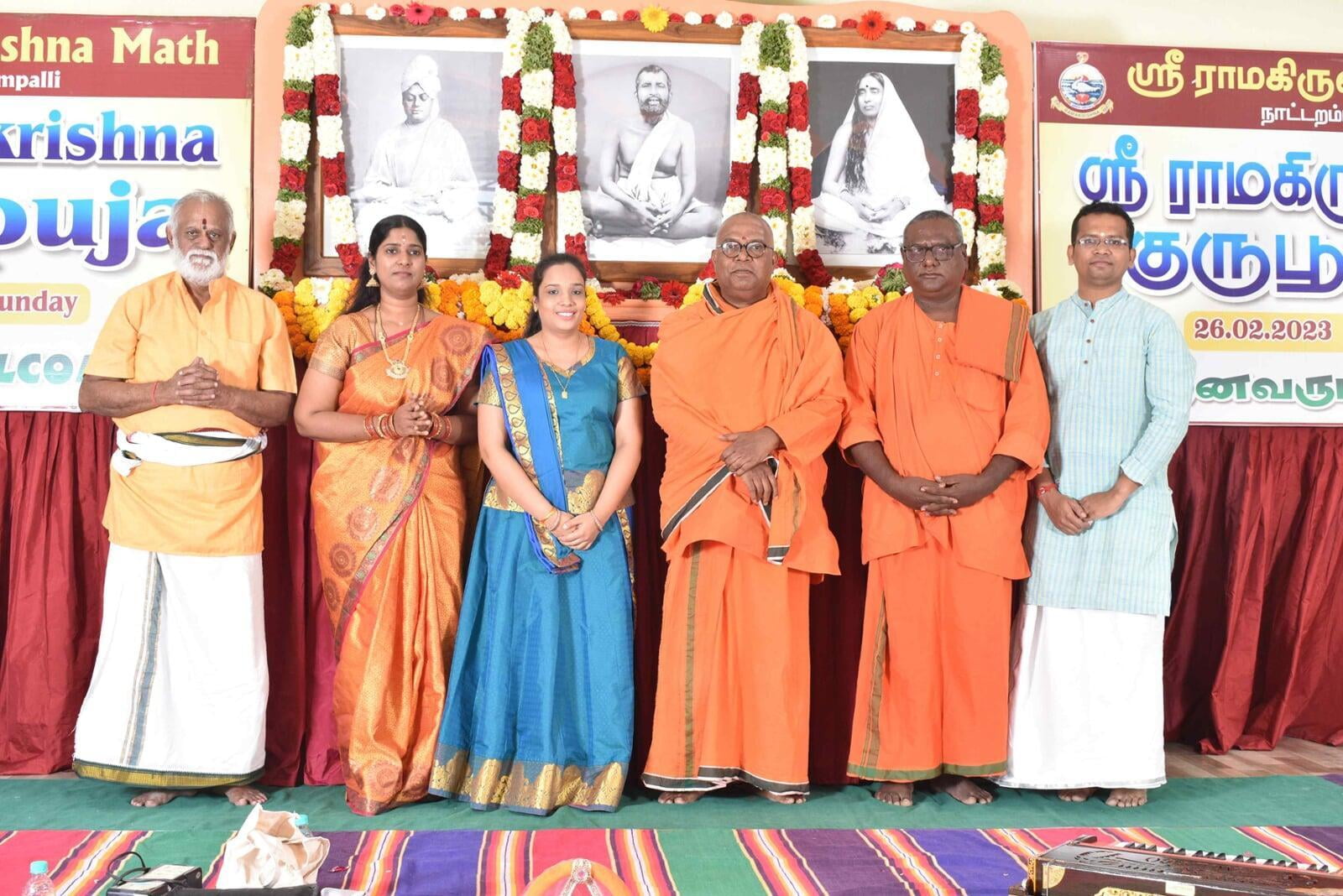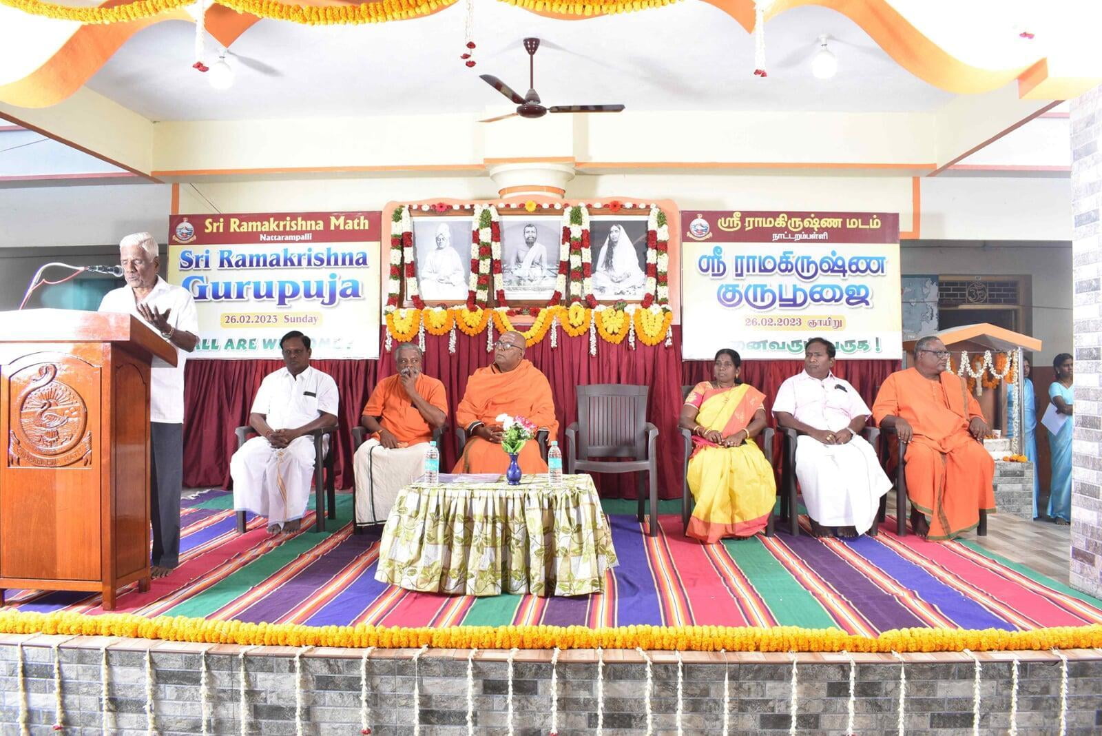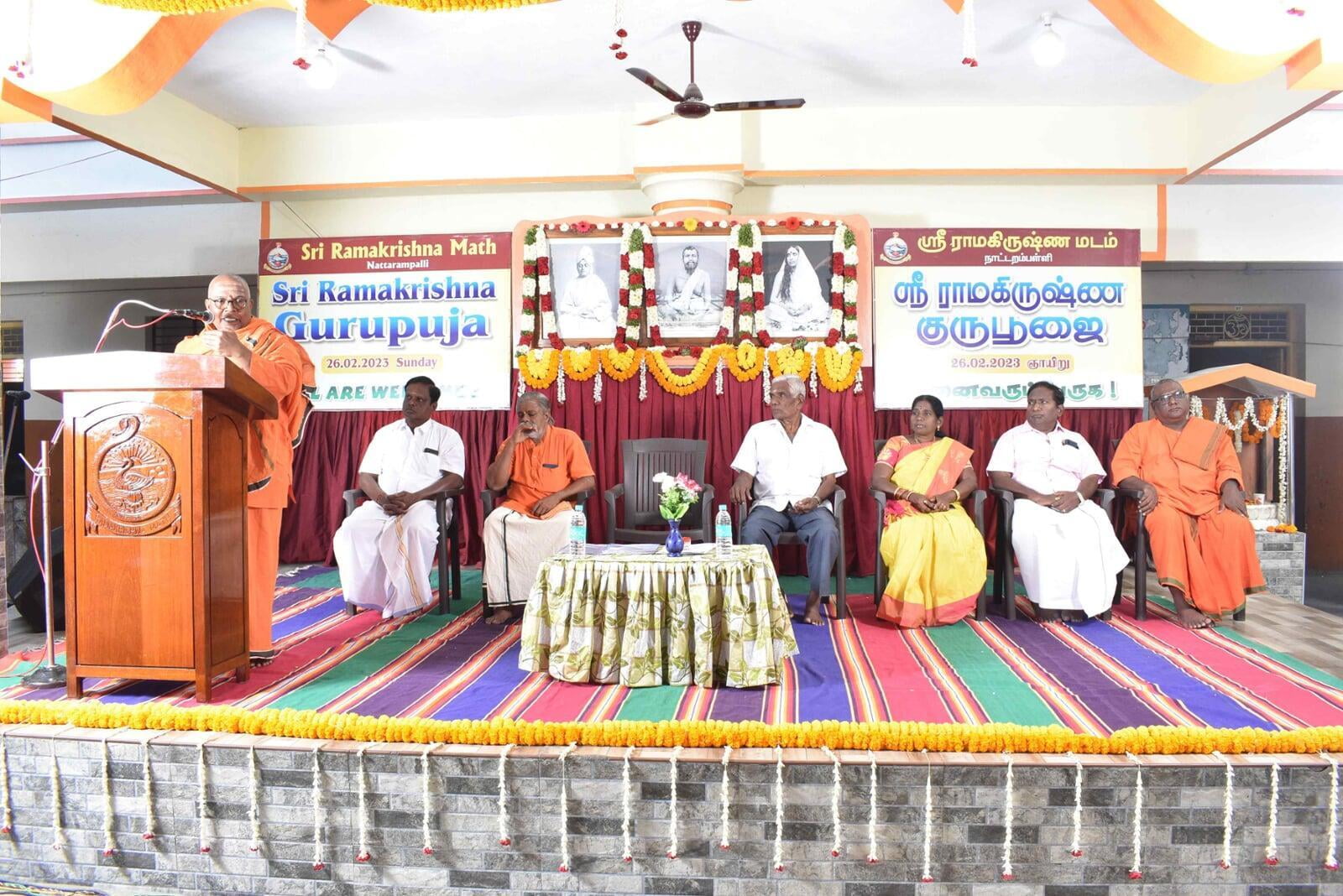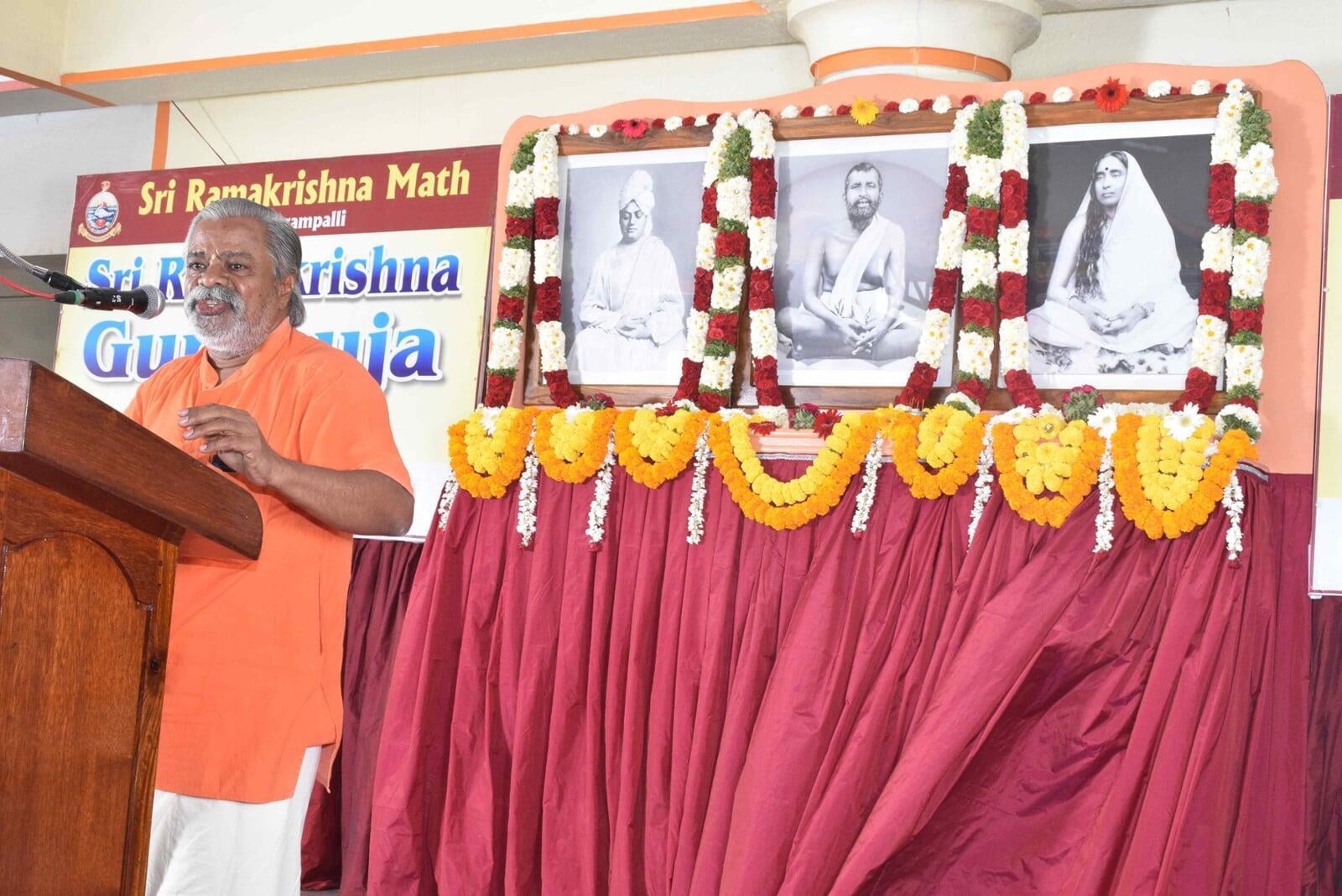 The Guru Puja public meeting started at 9.00 am with the benediction address from Swami Paramsukhanand Ji Maharaj who spoke about how Sri Ramakrishna has changed the world by showing the spiritual path to the common people. Bhajans were sung by Sri Ramakrishna Hari bhajan group who moved the devotees with their wonderful Naam Sankirtana. Shri Krishna Jagannathan, an eminent speaker inspired the people with his wonderful speech "Bharat and Swami Vivekananda''. About 1500 devotees partook of the noon prasad.