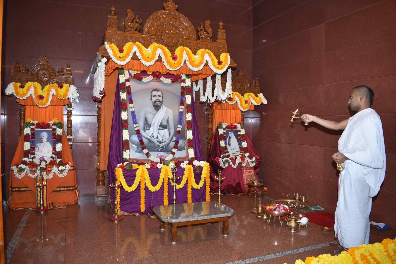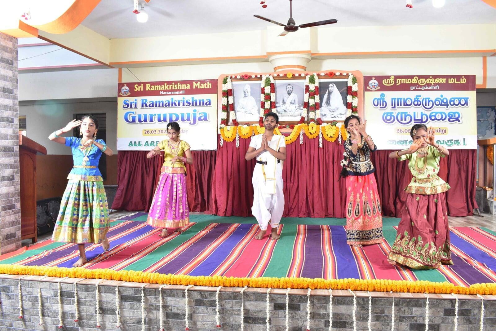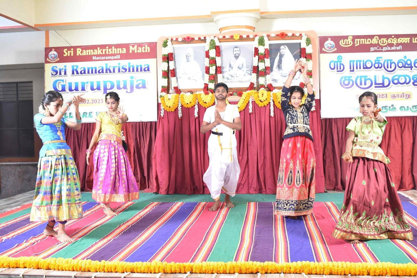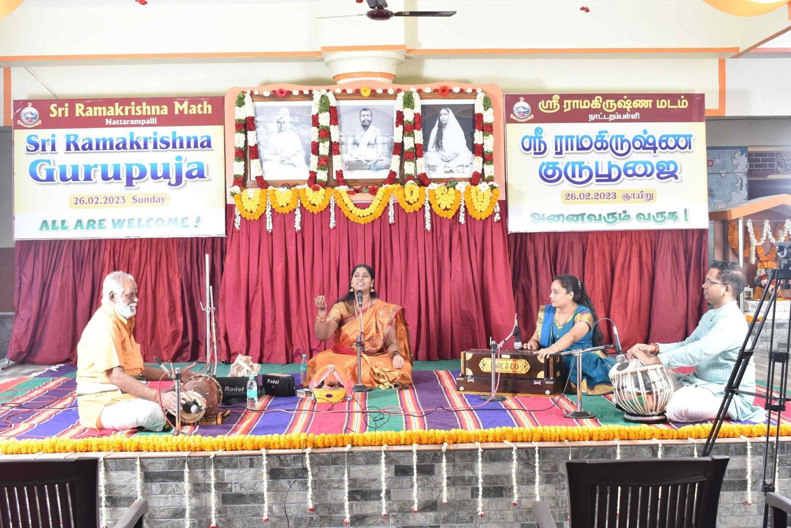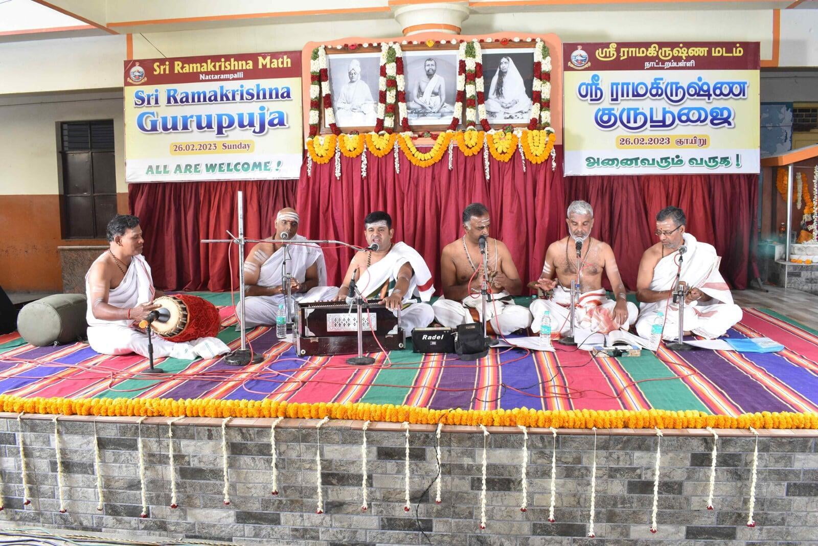 The Guru Puja public meeting started at 9.00 am with the benediction address from Swami Paramsukhanand Ji Maharaj who spoke about how Sri Ramakrishna has changed the world by showing the spiritual path to the common people. Bhajans were sung by Sri Ramakrishna Hari bhajan group who moved the devotees with their wonderful Naam Sankirtana. Shri Krishna Jagannathan, an eminent speaker inspired the people with his wonderful speech "Bharat and Swami Vivekananda''. About 1500 devotees partook of the noon prasad.